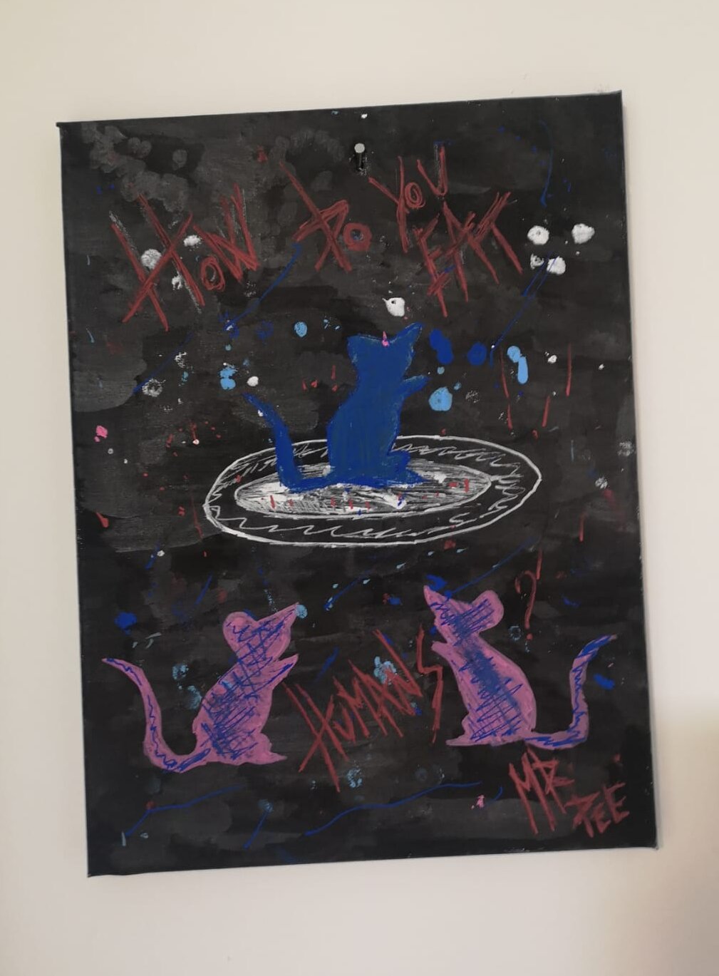This evocative piece features two pink rats gazing at a third rat, seated on a plate as though served as a meal. The scene is a visceral commentary on humanity's capacity for self destruction, symbolized by the rats, which consistently represent humans in Mr. Pee's work. The bold, blood-red inscription, "How do you eat humans," underscores the disturbing act of humans metaphorically and literally preying upon one another. Set against a dark, chaotic backdrop, the artwork highlights themes of violence, survival, and moral decay, confronting the viewer with uncomfortable questions about human nature.